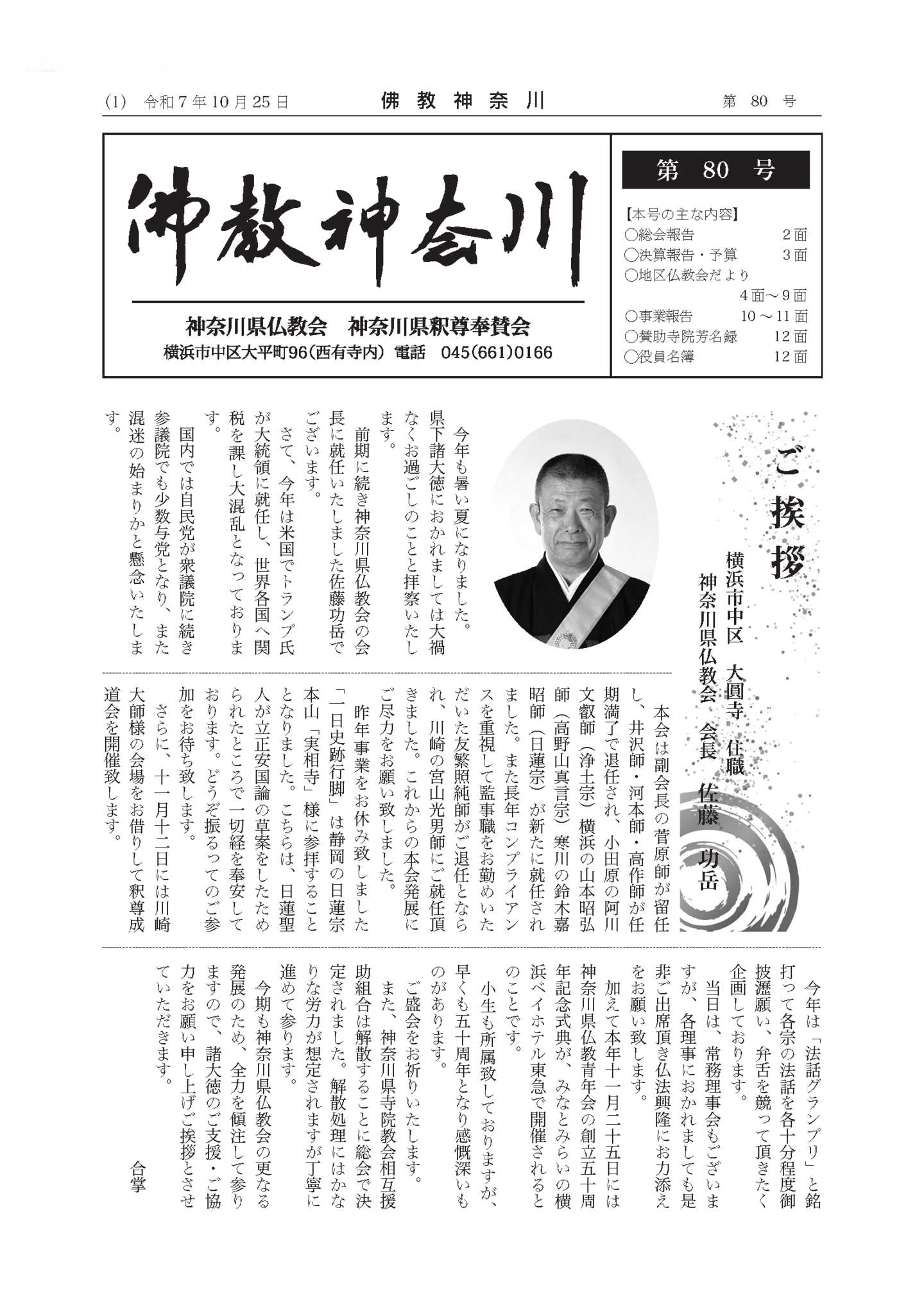 会報「仏教神奈川」 一年に一度、様々な企業・商店のご協力の下、神奈川県仏教会の会員寺院向けに会報を発行しております。 仏教神奈川80号ダウンロード ※会報「仏教神奈川」は80号以降よりWEBサイトでダウンロード可能なように致します。